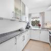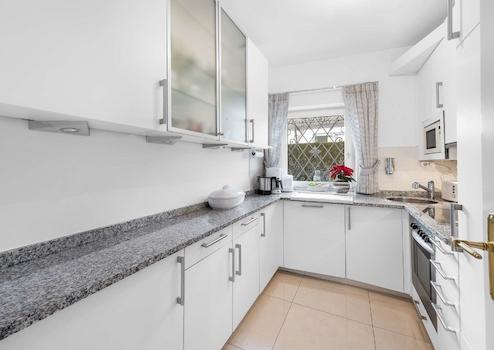 Die separate Küche präsentiert sich hochwertig ausgestattet mit zeitlosen weißen Fronten und sämtlichen Geräten des täglichen Bedarfs – funktional und zugleich elegant.