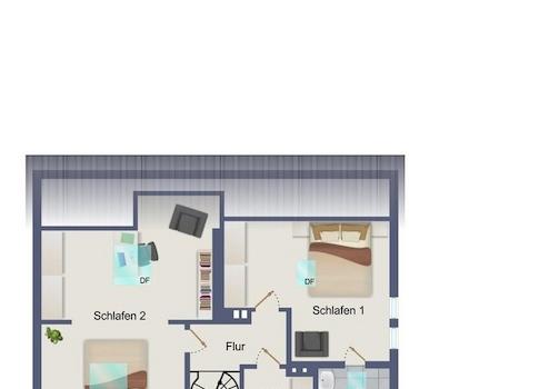 Zu der Wohung gehöhren im Dachgeschoss ein Schlafzimmer, ein weiterer großer Raum der als Schlafzimmer, Kinderzimmer oder Büro genutzt werden kann, ein Abstellraum und eine Toilette.