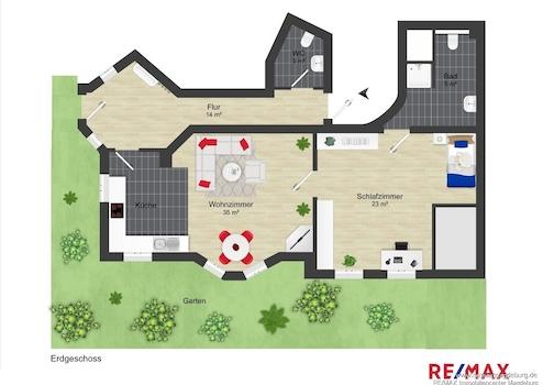 Die Wohnung im Erdgeschoss ist wie folgt aufgeteilt: