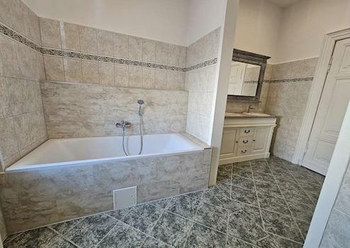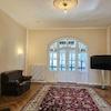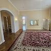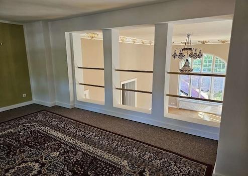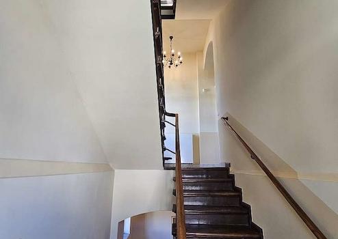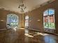 Über eine großzügige Außentreppe gelangen Sie zunächst in den Windfang und anschließend in die zentrale Eingangsdiele des Erdgeschosses. Von hier aus erschließen sich zwei Badezimmer sowie drei geräumige Zimmer mit Flächen von etwa 25 bis 35 m². Eines dieser Zimmer dient als Durchgangsraum und führt sowohl in ein weiteres großes Zimmer mit rund 33 m² als auch in einen beeindruckenden Saal mit einer Raumhöhe von etwa 5,20 m und einer Fläche von ca. 60 m².