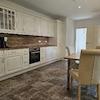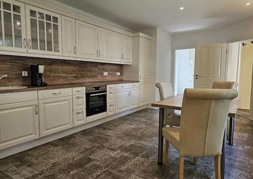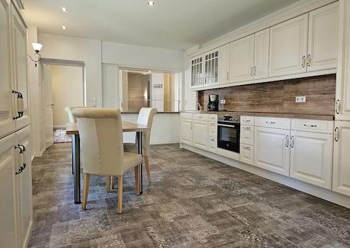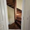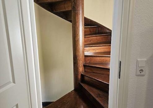 Die etwa 23 m² große Küche ist ebenfalls über das Durchgangszimmer erreichbar und verfügt über einen angrenzenden Vorratsraum. Von hier aus gelangt man zudem zu einer im Turm befindlichen Wendeltreppe. Diese führt in ein separates Turmzimmer im oberen Bereich, das zum Saal hin offen gestaltet ist und als Empore genutzt werden kann.