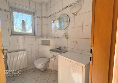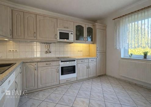 Die Küche ist funktional geschnitten und bietet ausreichend Platz für einen gemütlichen Essbereich. Ergänzend stehen ein Gäste-WC sowie ein praktischer Hauswirtschaftsraum zur Verfügung, der ebenfalls einen direkten Zugang in den Garten bietet und somit kurze Wege garantiert.