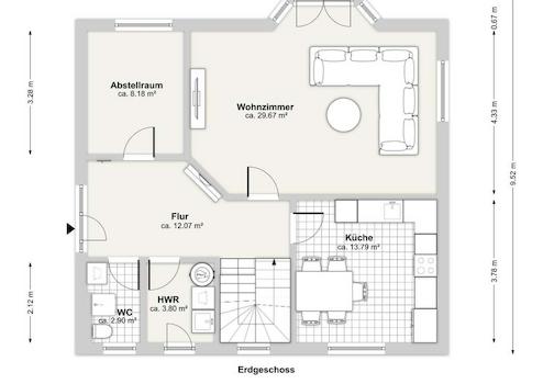 Im Erdgeschoss empfängt Sie ein zentral gelegener Flur, der alle Räume miteinander verbindet. Ein vielseitig nutzbares Zimmer bietet sich ideal als Gäste-, Arbeits- oder Hobbyraum an. Der Wohnbereich präsentiert sich hell und ermöglicht durch den direkten Zugang zur Terrasse einen fließenden Übergang ins Freie. Hier lassen sich entspannte Stunden mit Familie und Freunden genießen.