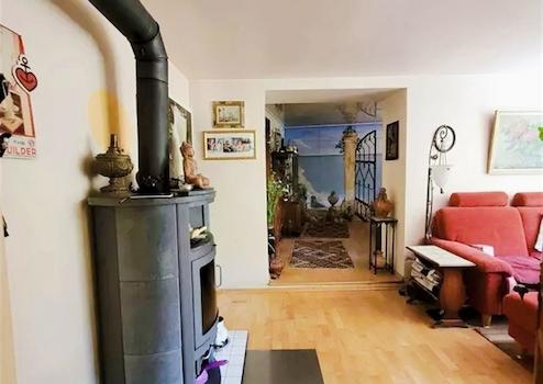 Großzügiger Wohnbereich mit Kaminofen für angenehme Wärme und gemütliche Atmosphäre