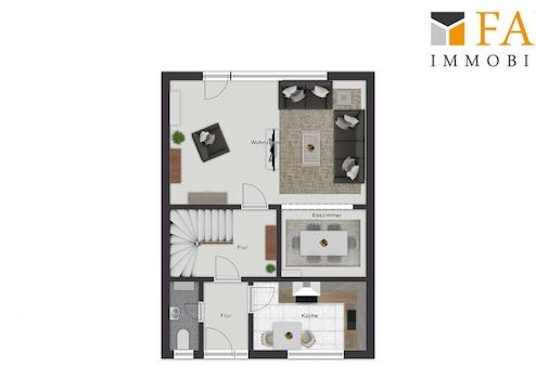 Im Erdgeschoss befindet sich der Mittelpunkt des Hauses: der großzügige Wohn- und Essbereich, der als Herzstück des Familienlebens fungiert. Hier finden gemeinsame Mahlzeiten, gesellige Abende und entspannte Stunden den passenden Rahmen. In den Sommermonaten ermöglicht der direkte Zugang zur Terrasse und in den Garten ein harmonisches Wohnerlebnis mit fließendem Übergang ins Freie. Ebenfalls im Erdgeschoss befinden sich die Küche sowie ein Gäste-WC.