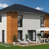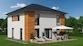 Der zweigeschossige Hausentwurf zur Stadtvilla bietet eine moderne Architektur mit einem Vordach und einer Teil-Holzverkleidung. An der Gartenseite des Hauses ist ein überdachter Terrassenbereich und ein Anbauelement ...