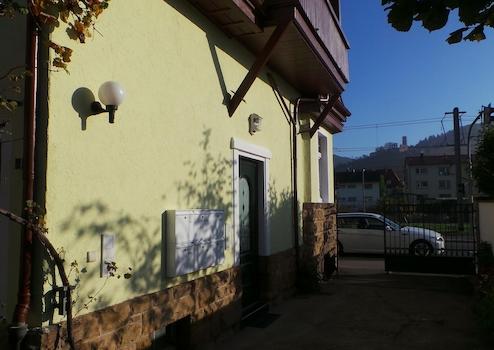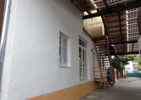 Der Zugang zur Wohnung befindet sich im hinteren Bereich des ehemaligen Innenhofes vom Weingut. Der Innenhof kann in den Sommermonaten von den Mietern mitgenutzt werden und bietet eine angenehme Möglichkeit, Zeit im Freien und unter Weinranken zu verbringen.