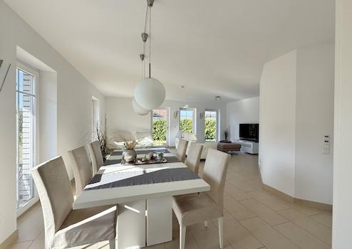 Der großzügige Wohn- und Essbereich bildet das Herzstück des Hauses. Große Fensterflächen sorgen für lichtdurchflutete Räume und eröffnen den Blick in den liebevoll angelegten, kaum einsehbaren Garten. Hier finden sowohl eine große Tafel als auch eine komfortable Sofalandschaft ihren Platz.