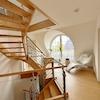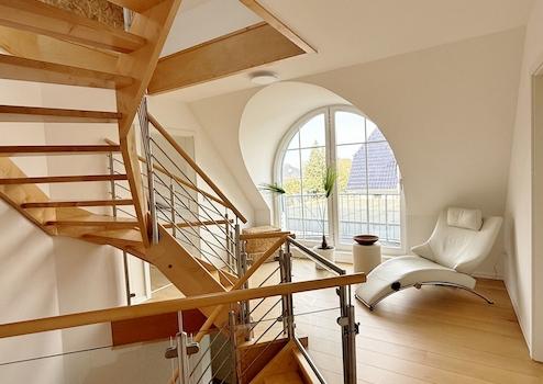 Über eine offene Edelstahltreppe mit stilvollen Ahornstufen erreichen Sie das Obergeschoss.