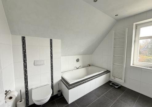 Das stilvolle Vollbad präsentiert sich in zeitloser Eleganz: helle Wandfliesen, kontrastierende Bodenfliesen, eine Badewanne und eine separate Dusche sowie zwei Waschbecken sorgen für modernen Komfort.