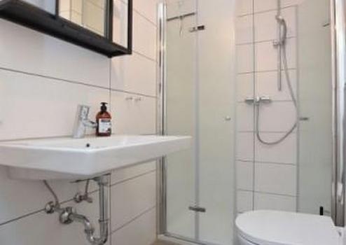 Küche und ein modernes Badezimmer mit Dusche.