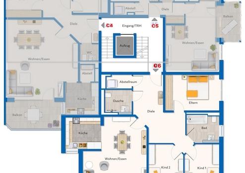 Auf der Karl-Reulen-Straße 40 bieten wir diese barrierearme und große 4 Zimmer-Mietwohnung mit Aufzug, Keller und Tiefgarage an. Wohnung C6 1 OG Mitte, 126,67 m² Wohnfläche 4 Zimmer, Küche, Diele, Bad, Dusche/WC, ...