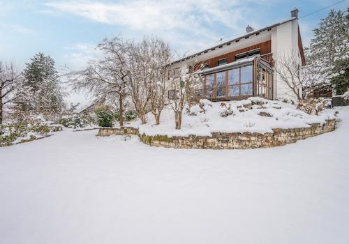 Dieses gepflegte Zweifamilienhaus empfängt Sie über eine überdachte Einfahrt mit zwei Garagen, von der aus Sie direkt in das zentrale Treppenhaus gelangen, das beide Wohneinheiten erschließt. Dank zweier separater ...