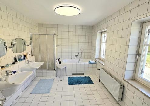 -Großes Bad (12,99 m²) mit zwei Waschbecken, Duschkabine und Badewanne.