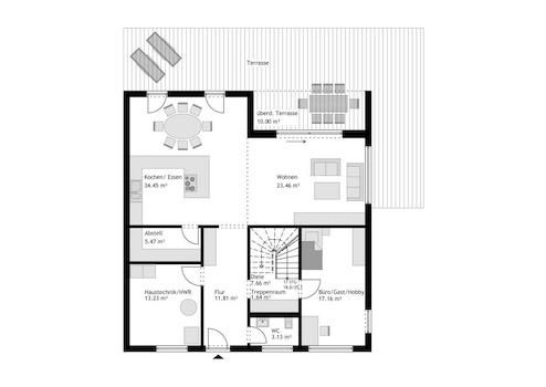 Die Ausführung in der Ausbaustufe 3 - FastFertigPlus umfasst eine hochwertige Sanitär-Grundausstattung, wobei Sie bei der Umsetzung der haustechnischen Gewerke wie Heizung, Lüftung, Sanitär und Estrich auf erfahrene Fachbetriebe vertrauen können. Das Haus ist mit einer modernen Wärmepumpe ausgestattet, die für eine umweltfreundliche und energieeffiziente Beheizung sorgt. Diese nachhaltige Befeuerungsart garantiert nicht nur eine angenehme Wärme, sondern schont auch die Ressourcen und senkt Ihre Energiekosten langfristig. Die luxuriöse Ausstattung des Hauses unterstreicht die erstklassige Qualität und den hohen Wohnkomfort, den Sie von einem STREIF-Haus erwarten dürfen.