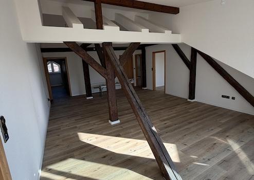 Die Wohnung verfügt über vier Zimmer und überzeugt durch ihren besonderen Charakter: sichtbare Holzbalken in nahezu allen Räumen verleihen dem Loft einen einzigartigen Charme und unterstreichen das offene Raumgefühl. Das Badezimmer ist mit Badewanne und Dusche ausgestattet, zusätzlich steht ein separates Gäste-WC im Eingangsbereich zur Verfügung.