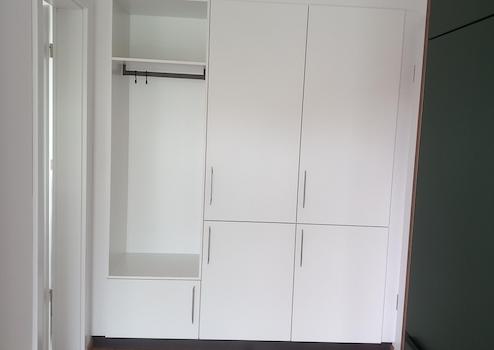 Ein großer Einbauschrank finden Sie direkt am Eingang der Wohnung, daneben eine große hochwertige Einbauküche mit Spülmaschine und E-Geräten, Backofen, Kühleschrank mit Gefrierfach usw.