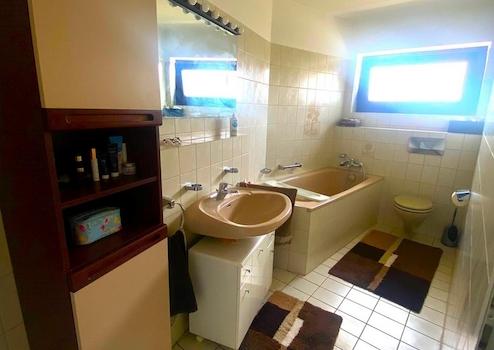 Über das Treppenhaus gelangt man in den 1. Stock. Dort befinden sich das Elternschlafzimmer und zwei weitere Zimmer sowie ein Dusch- und ein Wannenbad. Das Wannenbad ist exklusiv über das Elternschlafzimmer zugänglich. Der Balkon in einem der beiden weiteren Zimmer bietet eine unverbaute Sicht bis nach Rheinbach.