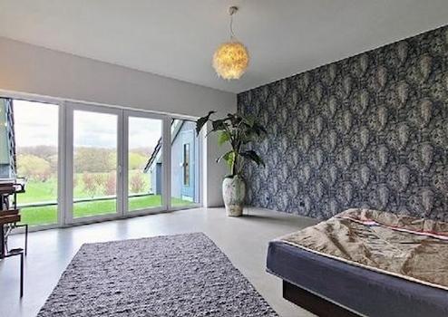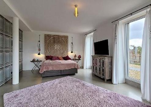 Schlafzimmer ist mit stilvollen Einbauten ausgestattet, drei große