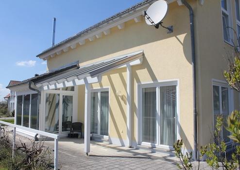 Die 3-seitig umlaufende Terrasse ist zu Teilen von einem Glasdach überspannt und bildet im Sommer einen bevorzugten Aufenthaltsort für die ganze Familie.