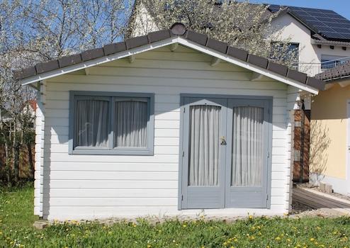 Das geräumige, separate Gartenhaus ermöglicht die geschützte Unterbringung von Gartengeräten und -möbeln sowie Grillutensilien und allem, was man als Eigenheimer so alles braucht.