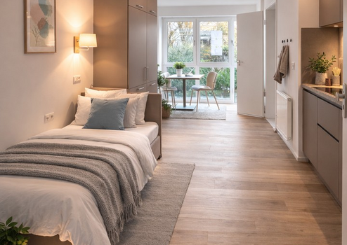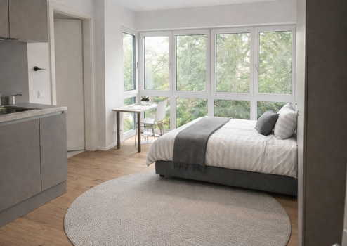 Der helle Wohn-/Schlafbereich mit integrierter, hochwertiger Einbauküche, sehr hochwertiger Möblierung, Fussbodenheizung, bodentiefe Fenster, sowie das moderne Bad bieten alles, was man für den Studienalltag kompakt und komfortabel braucht.