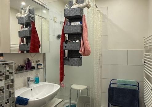 das Badezimmer ist im laufe der Jahre neu gefliest worden. Das Bad ist mit einer Dusche ausgestattet.