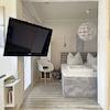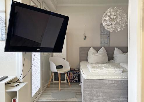 Im Übergang wurde ein schwenkbarer Flachbild-Fernseher installiert, damit man von beiden Räumen aus bequem fernsehen kann. Er wurde inzwischen durch einen größeren ersetzt.