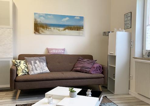 Der Wohnbereich ist mit leichten, geschmackvollen, kleinen Möbeln und einer Couch im dänischen Möbelstil sowie dezenter maritimer Dekoration angenehm Ton-in-Ton gestaltet, ohne überladen zu wirken.