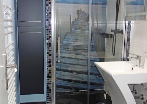 Das Highlight dieses Badezimmers aber ist zweifellos der Duschbereich mit einer tollen Aussicht, einem beeindruckenden Foto hinter Glas, welches den Raum optisch noch vergrößert und auf jeden Fall für ein ungewöhnliches Duschgefühl sorgt!