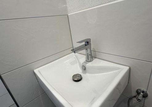 Das Badezimmer ist modern ausgestattet. Zur Wohnung gehört außerdem ein Kellerabteil, das zusätzlichen Stauraum bietet.
