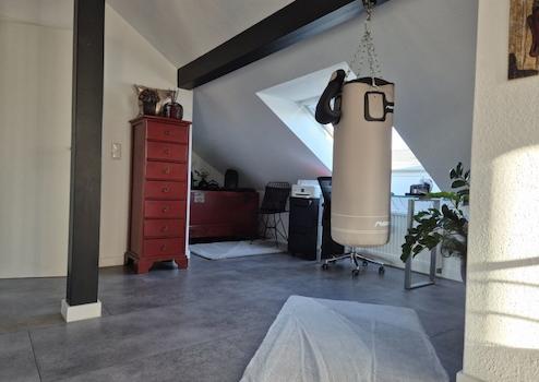 Die Wohnung selbst ist nach Südwesten ausgerichtet, sodass sie von morgens bis abends von Sonnenlicht durchflutet wird. Die zahlreichen Fenster im Dachgeschoss bieten zudem einen herrlichen Blick auf den Sonnenuntergang, der oft in einem wunderschönen, glutroten Farbenspiel erstrahlt. Darüber hinaus sorgt die Vielzahl an Fenstern im Dachgeschoss für eine ausgezeichnete Belüftung, wodurch es auch im Sommer angenehm kühl bleibt.