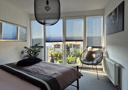 Im Jahr 2024 wurden zudem die Fenster in einem der Schlafzimmer erneuert, während die anderen Holzfenster im oberen und unteren Bereich frisch gestrichen wurden. Die Dachfenster in den Dachschrägen im Bad und im Galeriebereich sind moderne Kunststofffenster. Im Sommer sorgt eine Sonnenschutzfolie an den oberen Fenstern für angenehme Kühle, während eine gute Belüftung für ein angenehmes Raumklima sorgt.