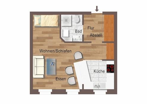 Auf rund 38 m² Wohnfläche überzeugt das Apartment durch einen funktionalen und zugleich zeitgemäßen Grundriss. Der Wohn- und Schlafbereich ist offen gestaltet und geht harmonisch in den offenen Kochbereich über, wodurch ein angenehmes Raumgefühl entsteht. Der verlegte Parkettfußboden verleiht dem Raum eine warme, wohnliche Atmosphäre und unterstreicht den gepflegten Gesamteindruck der Einheit.