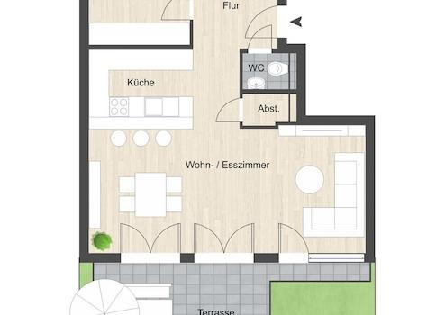 Vom Wohnbereich aus haben Sie einen direkten Zugang zur sonnigen Westterrasse mit eigenem kleinem Garten.