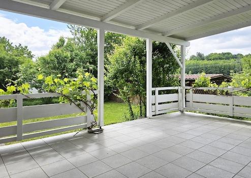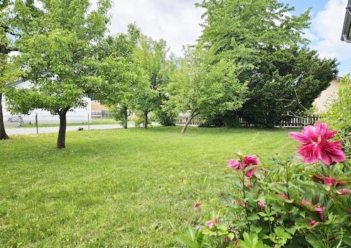 Im Außenbereich lädt der weitläufige Garten mit Obst- und Zierbäumen zum Entspannen ein.