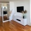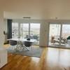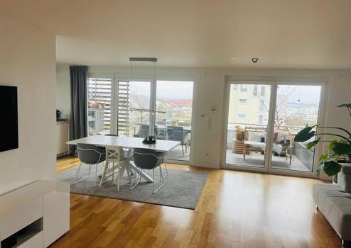 Der offene Wohn-, Ess- und Küchenbereich bildet das Herzstück der Wohnung. Große Fensterfronten sorgen für ein lichtdurchflutetes Ambiente und bieten direkten Zugang zum sonnigen Süd-West-Balkon mit Blick über Zier-Kirschbäume hinweg bis zum Stuttgarter Fernsehturm. Fantastische Sonnenuntergänge sind hier garantiert.