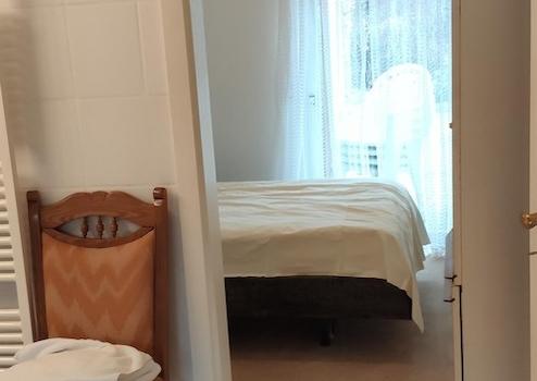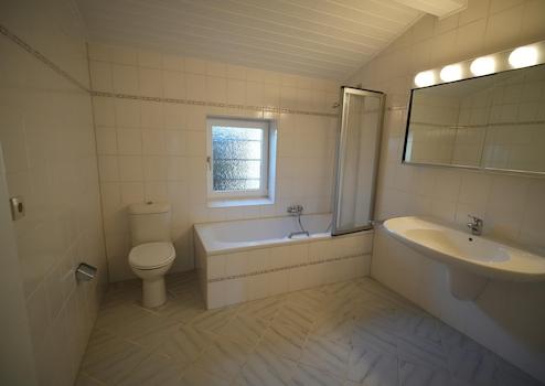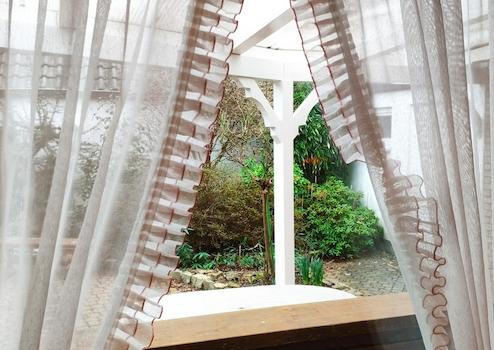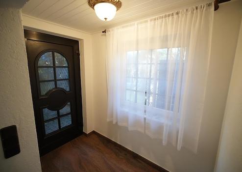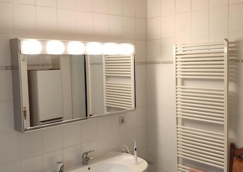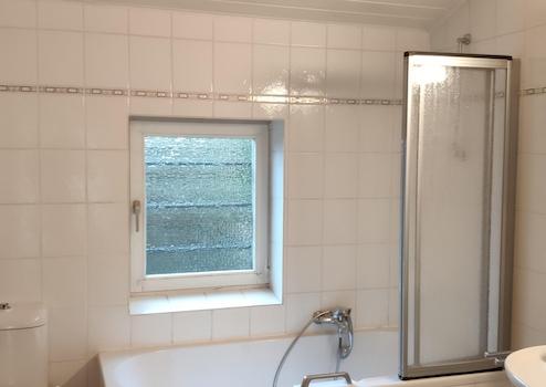 Das Badezimmer verfügt über eine Dusch-Badewanne, ergänzt durch ein separates Gäste-WC. Ein kleines Büro oder Gästezimmer mit direktem Zugang zum Garten eröffnet vielseitige Nutzungsmöglichkeiten – sei es für Homeoffice oder Besucher. Abgerundet wird die Ausstattung durch eine Garage mit Zugang von Straße und Garten, ein bis zwei Stellplätze auf der Einfahrt sowie einen kleinen Kellerraum, der über den Innenhof erreichbar ist.