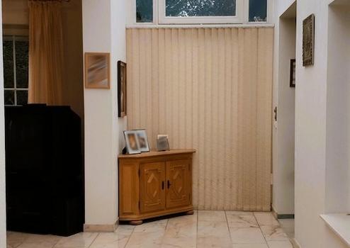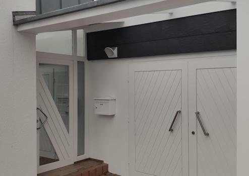 Besonders praktisch ist der barrierefreie Nebeneingang, der das flexible Erreichen des Hauses erleichtert. Der 2022 mit neuer Markise modernisierte Glas-Zwischengang verbindet die Bereiche des Hauses nicht nur funktional, sondern schafft auch ein lichtdurchflutetes architektonisches Highlight.