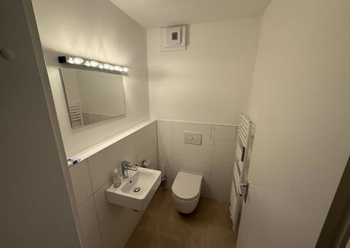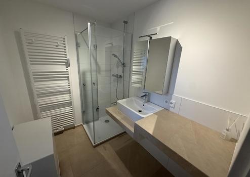 Top-sanierte Badezimmer mit modernen Fliesen, hochwertigen Armaturen und stilvoller Beleuchtung
