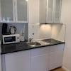 In der Marke-Einbauküche mit Esstisch kann man sich lecker verköstigen. Die Einbauküche ist mit allem ausgestattet was man zum Kochen braucht. Vom Kochlöffel bis zum Messbecher. Mikrowelle, Kaffeemaschine, Wasserkocher, Dunstabzug, Ceranfeld, Kühlschrank mit Gefrierfach sind im neuwertigen Zustand.