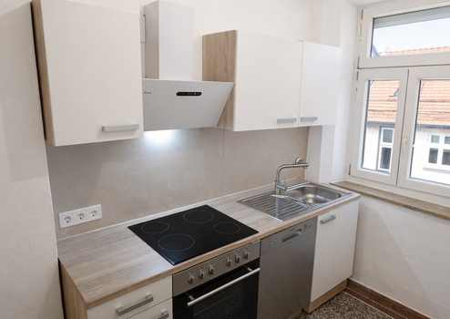 Die Wohnung verfügt über eine neue Einbauküche. Die Zimmer sind zudem mit den wesentlichen Möbeln ausgestattet (Bett, Schreibtisch, Stuhl, Kleiderschrank).