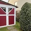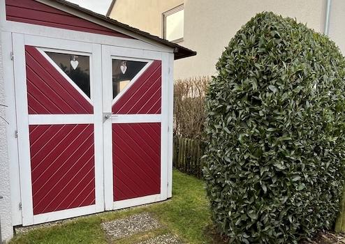An der Hausseite ist ein Holzschuppen angebaut, der viel Platz für Gartengeräte, Fahrräder und Kinderwagen bietet und gleichzeitig die Privatsphäre im dahinterliegenden Garten schützt.