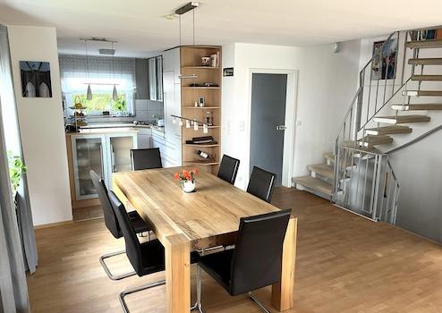 - Offener Wohn-/Essbereich mit Ahorn-Echtholzparket geölt