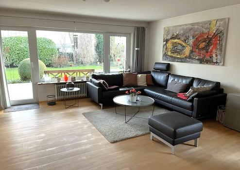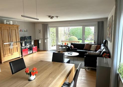 Wenn sie das Haus durch die einladende Haustür und die Diele betreten, fällt ihnen sofort das lichtdurchflutete Herzstück des Hauses auf. Der offene Wohn- / Essbereich mit Ahorn Echtholzparkett und integrierter gefliester Küche bietet viel Platz für die Familie. Er wird erweitert durch die große, sonnige und teilweise überdachte Terrasse in Südausrichtung, die mit hochwertigem Granit-Natursteinbelag ausgeführt ist. Eine elektrische Markise sorgt im Sommer bei Bedarf für wohltuenden Schatten und abends für ein lauschiges Plätzchen, wo sie den in 2004 liebevoll neu angelegten Garten von ihrem Gartenzimmer genießen können. Durch die Reihenendlage des Hauses genießen sie deutlich mehr Licht und Freiraum als in einem klassischen Mittelhaus. Ein Gäste-WC mit Fenster rundet den Komfort im Erdgeschoß ab.