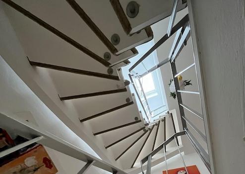 - Treppenhaus und Flur mit Teppichboden und Zugang zu den Zimmern