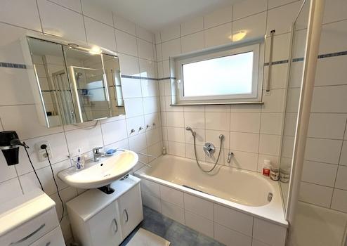 - Badezimmer gefliest mit Fenster, Waschbecken, Dusche, Badewanne, Handtuchheizkörper, WC