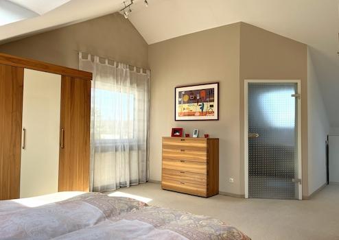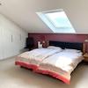 Weiter geht es über das offene Treppenhaus in das 2003 komplett neu ausgebaute und gedämmte Dachgeschoß. Die Decke wurde bis zum Giebel geöffnet, was ein großzügiges Raumgefühl schafft. Dachfenster auf beiden Seiten, im Süden mit Rollladen versehen, sorgen für Helligkeit und bieten die Möglichkeit einer schnellen Belüftung. Aktuell wird das Dachgeschoss als Schlafzimmer genutzt. Für Komfort sorgt auch hier ein eigenes Badezimmer mit Dusche und WC.