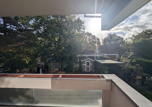 • Großzügiger Balkon mit Beleuchtung, Strom- und Wasseranschluss zur Bewässerung ihrer Balkonbepflanzung, elektrischer Markise und Blick in den gepflegten Garten.