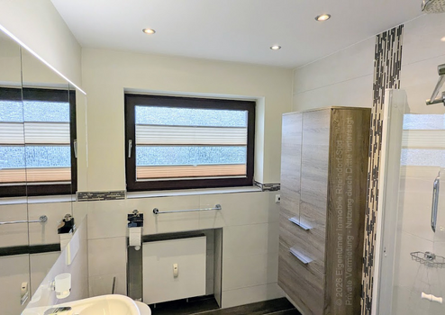 • Barrierearmes Bad: Vor wenigen Jahren modern saniert, ergonomisch optimiert mit bodenebener Dusche, elegante Wandfliesen und Boden in Holzoptik.